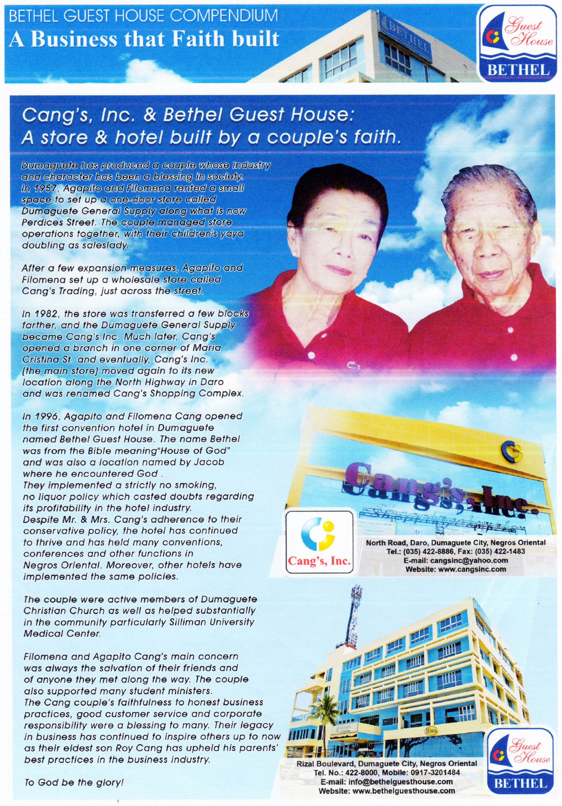 Filomena and Agapito Cang's main concern was always the salvation of their friends and of anyone they met along the way. The couple also supported many students ministers. The Cang's couple faithfulness to honest business practices, good customer service and corporate responsibility were a blessing to many. Their legacy in business has continued to inspire others up to now as their eldest son Roy Cang has upheld his parents' best practice in business industry.